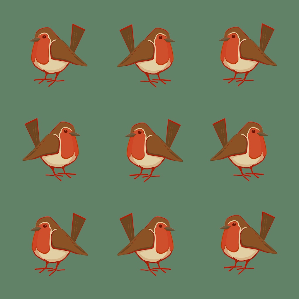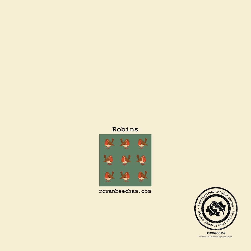 Unique and jolly Christmas card, card design is of nine fun little robins with red breasts set against a mid century green background, the inside of the card is blank for your own personal message, 12.5cmx12.5cm, printed in the UK on FSC paper, comes with a brown recycled paper envelope